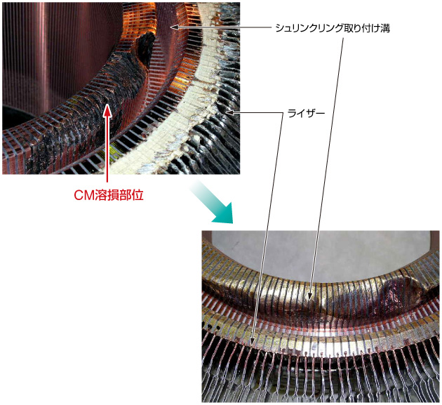 カーボン粉が入り、セグメント間短絡したためCMが溶損